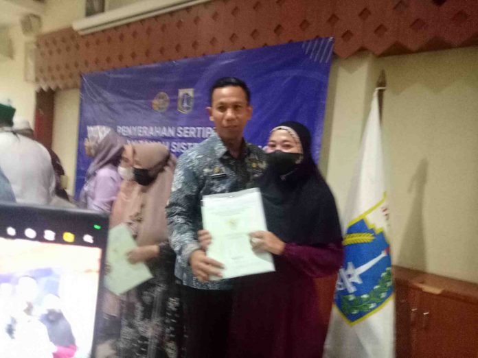 MEDIANSEAS.COM-Asisten Pemerintahan Kota Administrasi Jakarta Utara, Wawan Budi Rohman dan Kepala Badan Pertanahan Nasional (BPN) Jakarta Utara Taufik Suroso Wibowo S.SiT MH menyerahkan sertifikat Pendaftaran Tanah Sistematis Lengkap (PTSL) sebanyak 195 Sertifikat.